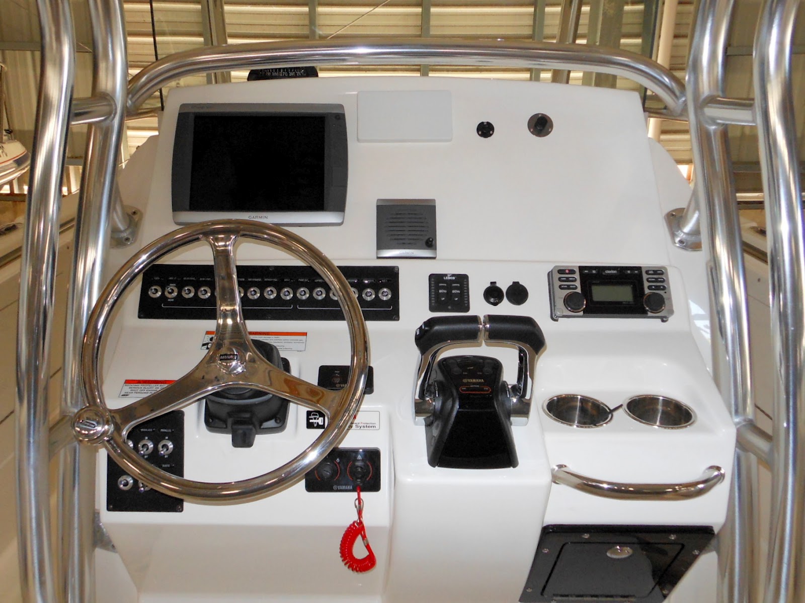 Lots of console space, is an understatement, and there are good ergonomics in the layout. My only wee gripe is the Yamaha engine gauge (top dead center was installed) at the factory by someone with the dreaded Cyclops Syndrome. That top center location would have made installing larger MDF's more difficult. In this case, 12" displays are not a problem.